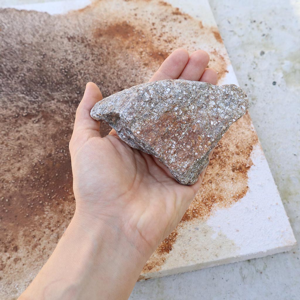 As mentioned above Valerija is using hand-selecting earth pigments made from soil, rocks, coal, chalk, clay and also raw crystals as calcite and rose quartz. All this mixed with acrylic medium as a guardian, her art stands resilient against the years. When painting is finished Valerija complete the story of it with her personal certificate. This certificate not only captures the pigments presentation but also bears her signature – a seal of authenticity.