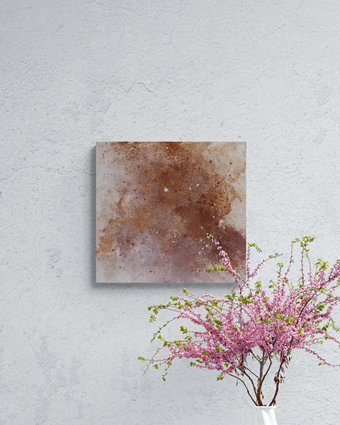 “Celestial Warmth” is a painting that radiates warmth, even on the coldest days. Made with earth pigments and orange calcite, it’s earthy tones evoke the comforting sunlight breaking through a chilly sky.