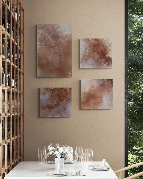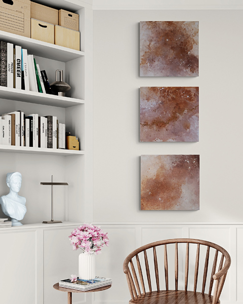 In creating this collection, she wanted each painting to resonate with the energy of being grounded on Earth while reaching for the sky. Imagine gazing at a night filled with stars and feeling not just wonder but also a sense of belonging. Imagine the quiet strength of a stone, the wisdom carried in its layers, and the warmth it radiates. This is the essence she tries to captured.