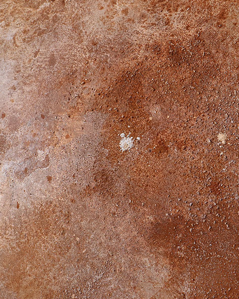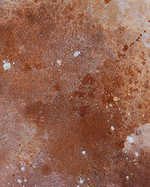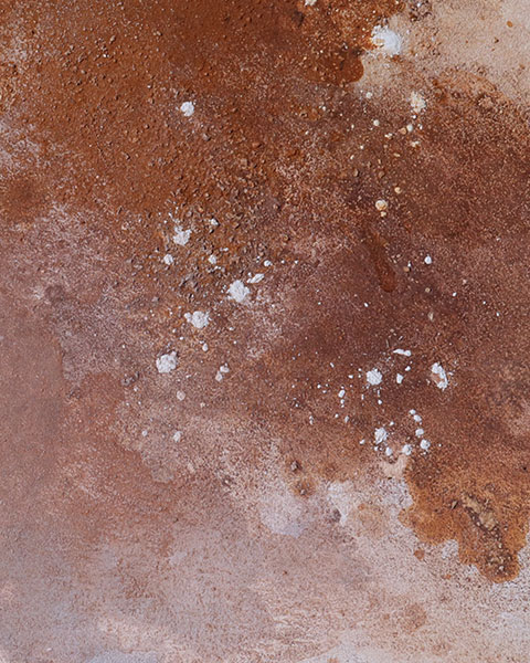 - pouring technique with mixed media: earth pigments from red soil, violet stone, black coal; raw orange calcite, amethyst crystal, white acrylic paint, sand, nonprocessed soil and white chalk.