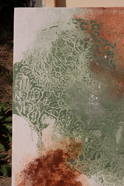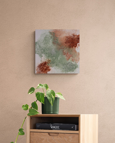 - pouring technique with mixed media: earth pigments, raw calcite, aventurine crystal, white acrylic paint, sand, nonprocessed soil and white chalk.