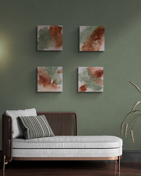 Those 15 paintings are a tribute to our profound connection with nature. Valerija’s vision transports you to the heart of the forest, where time seems to stand still and the forest becomes a place of solace and inspiration. In a world that often moves too fast, these artworks invite you to pause, breathe and reconnect with the Earth. The artist always likes to think of summer, so the warmth of the season is captured in the collection. The warm shades evoke the gentle kiss of the sun on the horizon, while the green shows the vibrant life that is at the heart of summer.