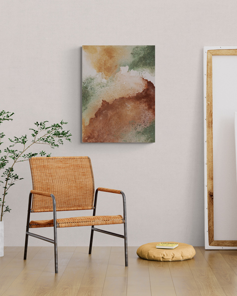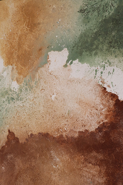 - pouring technique with mixed media: earth pigments, raw calcite, aventurine crystal, white acrylic paint, sand, nonprocessed soil and white chalk.