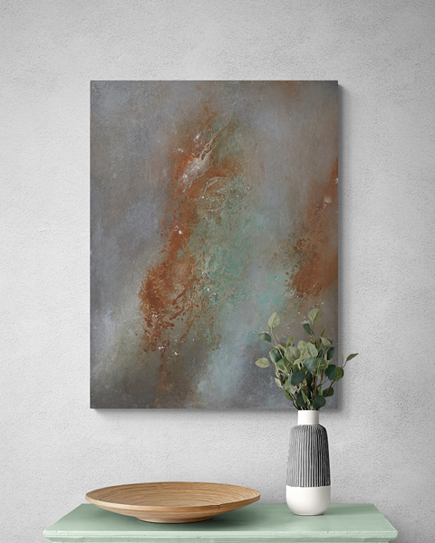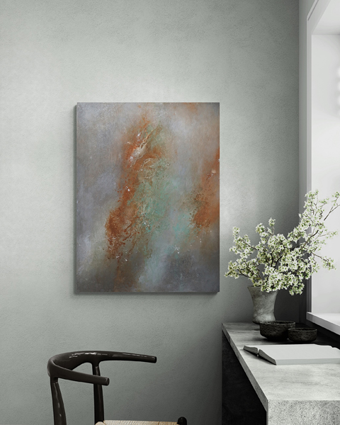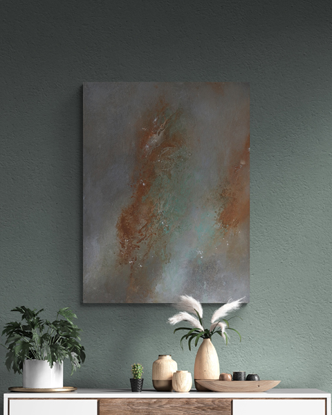 In creating this collection, she wanted each painting to resonate with the energy of being grounded on Earth while reaching for the sky. Imagine gazing at a night filled with stars and feeling not just wonder but also a sense of belonging. Imagine the quiet strength of a stone, the wisdom carried in its layers, and the warmth it radiates. This is the essence she tries to captured.