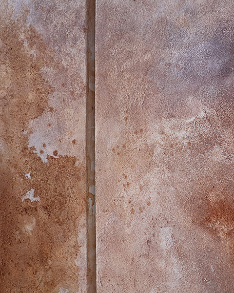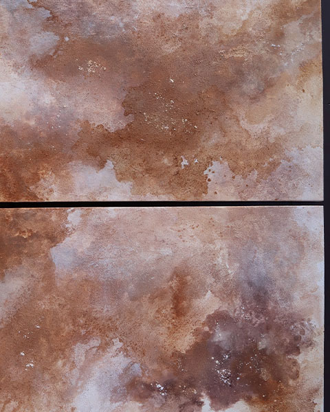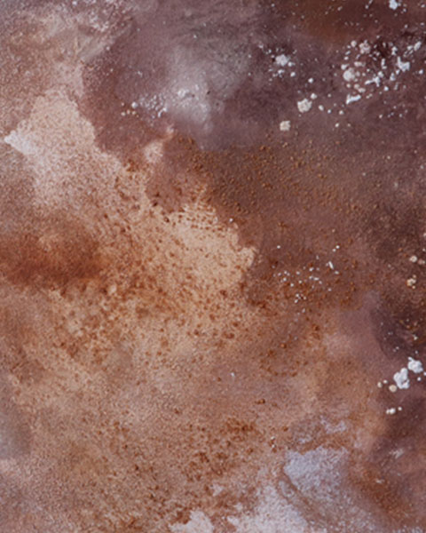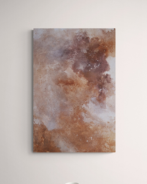- pouring technique with mixed media: earth pigments from red soil, violet stone, black coal; raw orange calcite, amethyst crystal, white acrylic paint, sand, nonprocessed soil and white chalk.