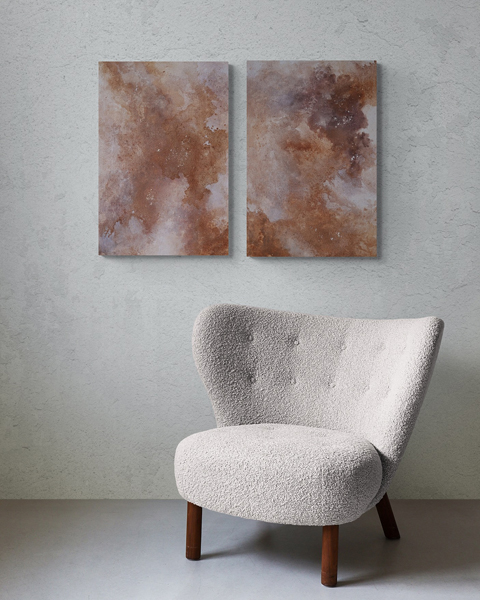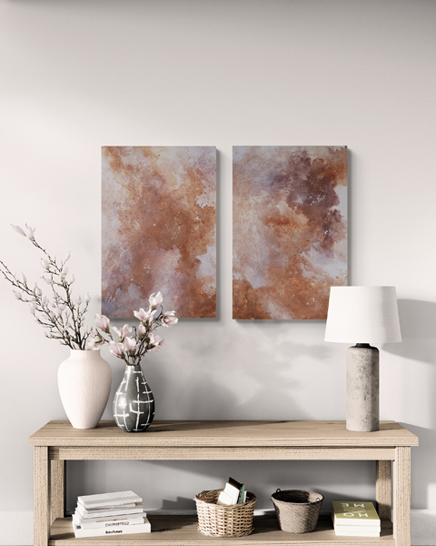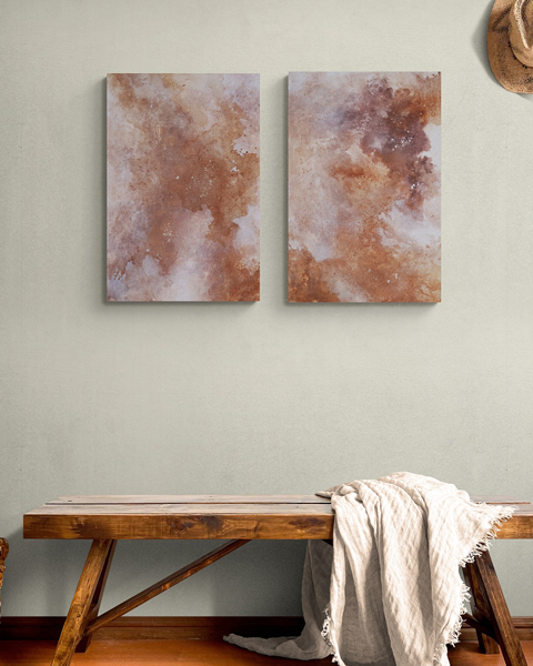 Here is the new collection that invites you into a journey of your existence, a dance of elements that reminds us of our deep, unbreakable connection to the Universe. In this collection, artist Valerija Fric, was inspired by the energy that binds us all – stars, earth, dreams, Universe and pure love of each other. Through 12 paintings made with natural pigments, raw orange calcite, ashes, and violet stone from the world around her, she tries to show her vision of the Universe where everything is possible. Each piece is made on a handmade wooden canvas, embracing the raw, organic energy that mirrors the universe itself.