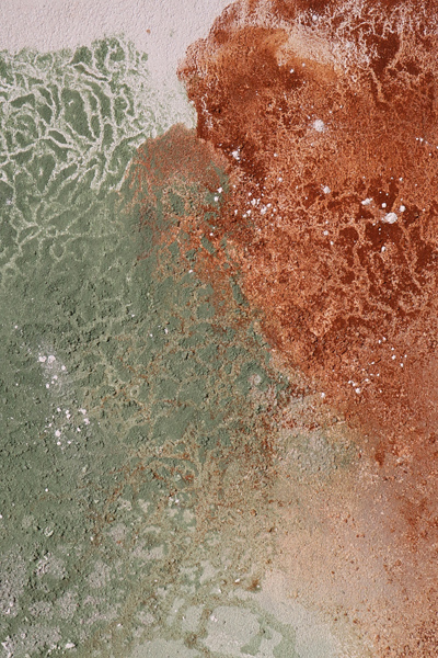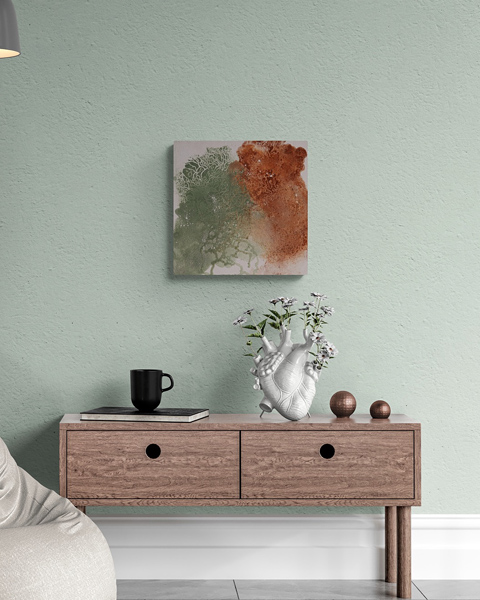 - pouring technique with mixed media: earth pigments, raw calcite, aventurine crystal, white acrylic paint, sand, nonprocessed soil and white chalk.