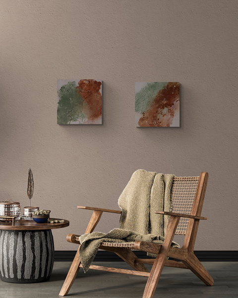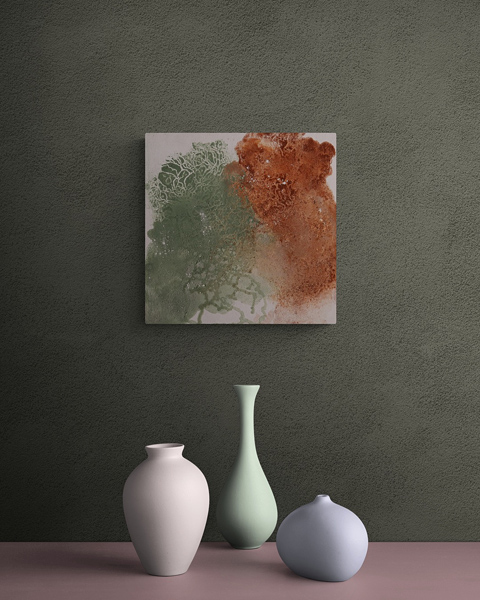 Valerija uses natural pigments in green and red-brown colors to reflect the earthy tones of the forest. Raw calcite and aventurine crystal add an energetic touch to the artworks and remind us of the treasures that Earth generously offers us.