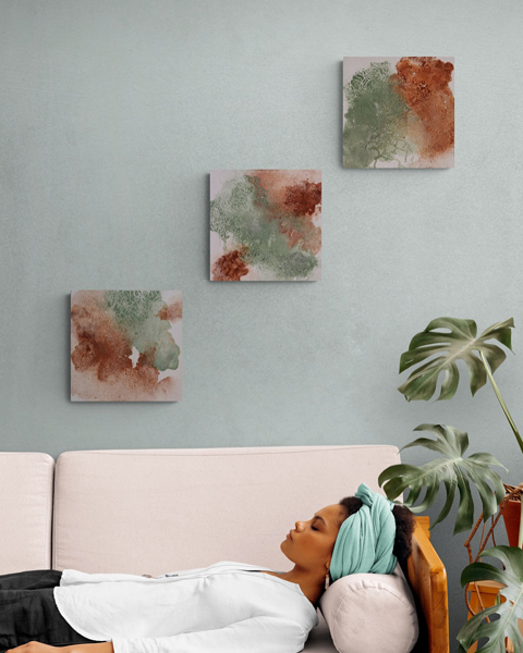 Those 15 paintings are a tribute to our profound connection with nature. Valerija’s vision transports you to the heart of the forest, where time seems to stand still and the forest becomes a place of solace and inspiration. In a world that often moves too fast, these artworks invite you to pause, breathe and reconnect with the Earth. The artist always likes to think of summer, so the warmth of the season is captured in the collection. The warm shades evoke the gentle kiss of the sun on the horizon, while the green shows the vibrant life that is at the heart of summer.