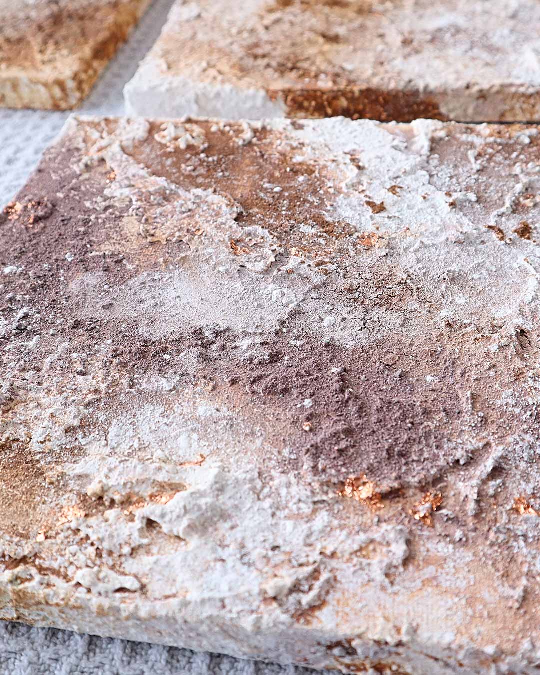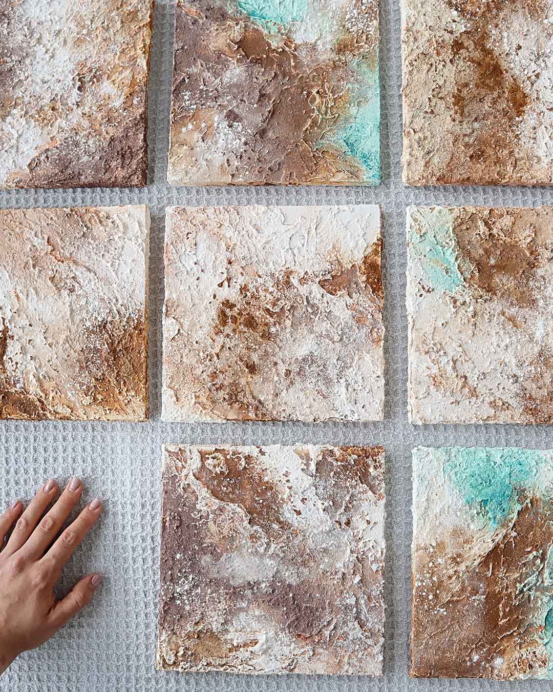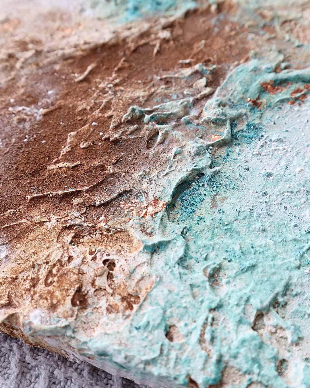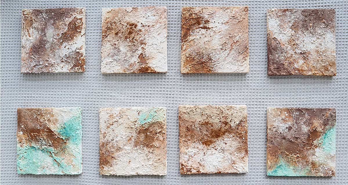 Eight unique paintings, each measuring 20x20cm, emerged as a testament to the magic of Death Valley. It’s a tribute to the resilience and enchantment of this natural wonder. Through this collection, she invites you to experience the beauty of Death Valley, to feel the heat of the sun and the whispers of the wind on every painting. Valerija used brown earth pigment, purple rock and homemade copper patina that gives this beautiful blue tones.