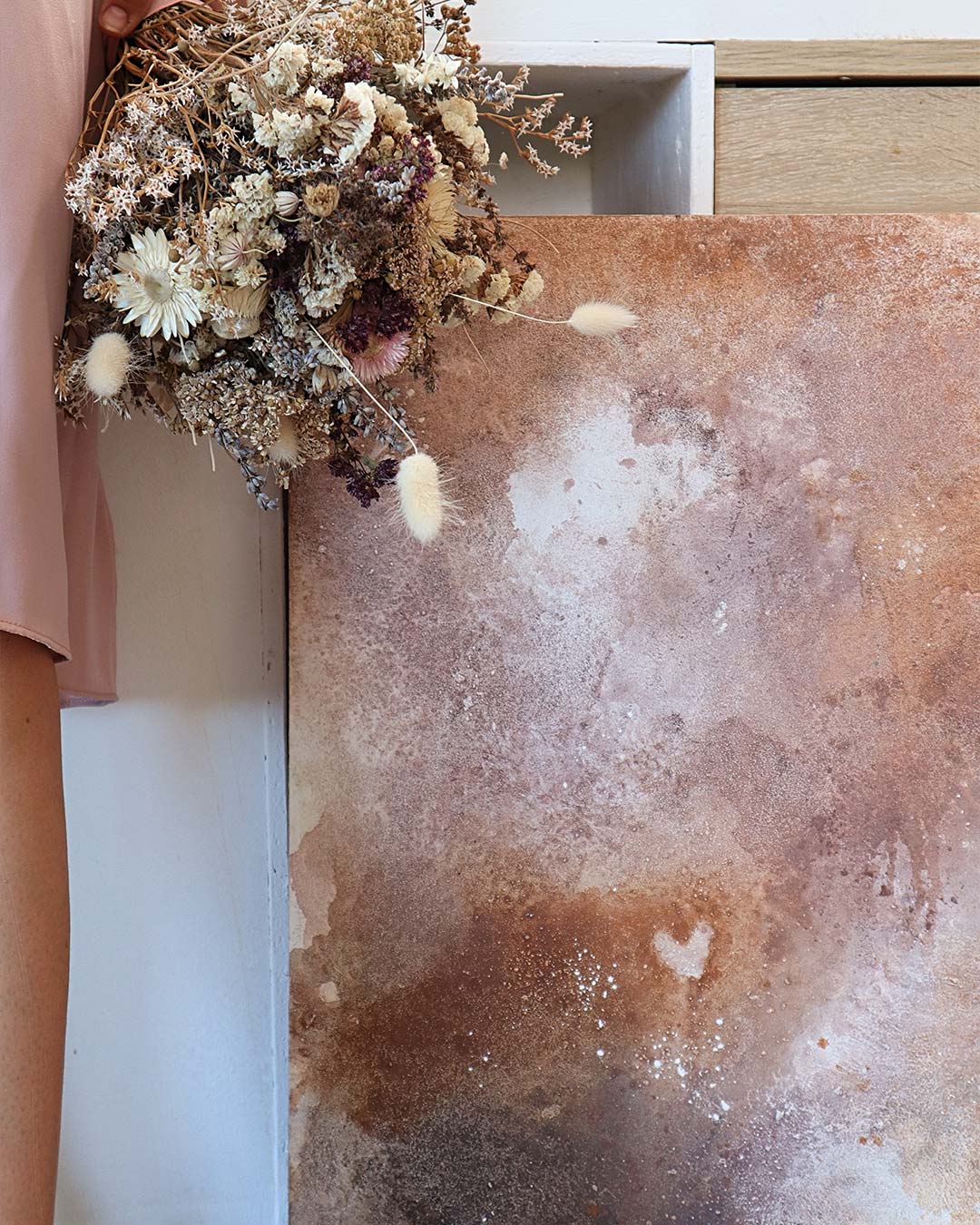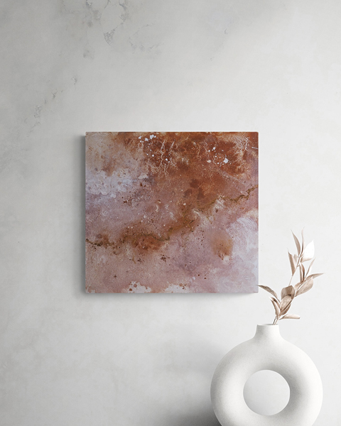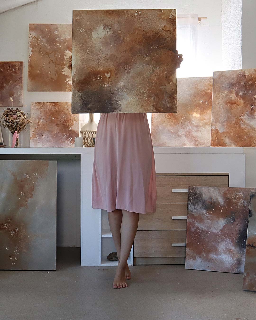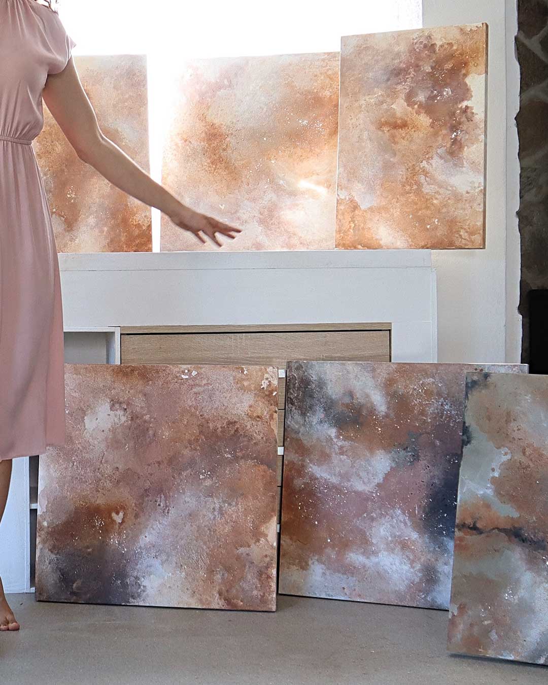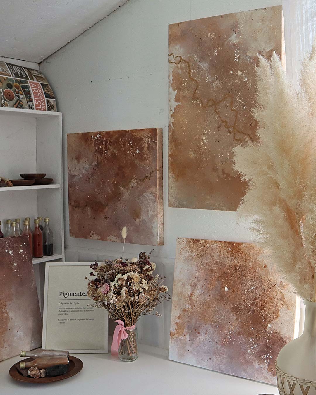 Each piece is made with earth pigments, ashes, raw orange calcite, and violet stone, layered on handmade wooden canvases to honor nature’s raw beauty. This collection is a reminder that we’re part of something infinite, grounding us on Earth while we’re reaching for the stars.