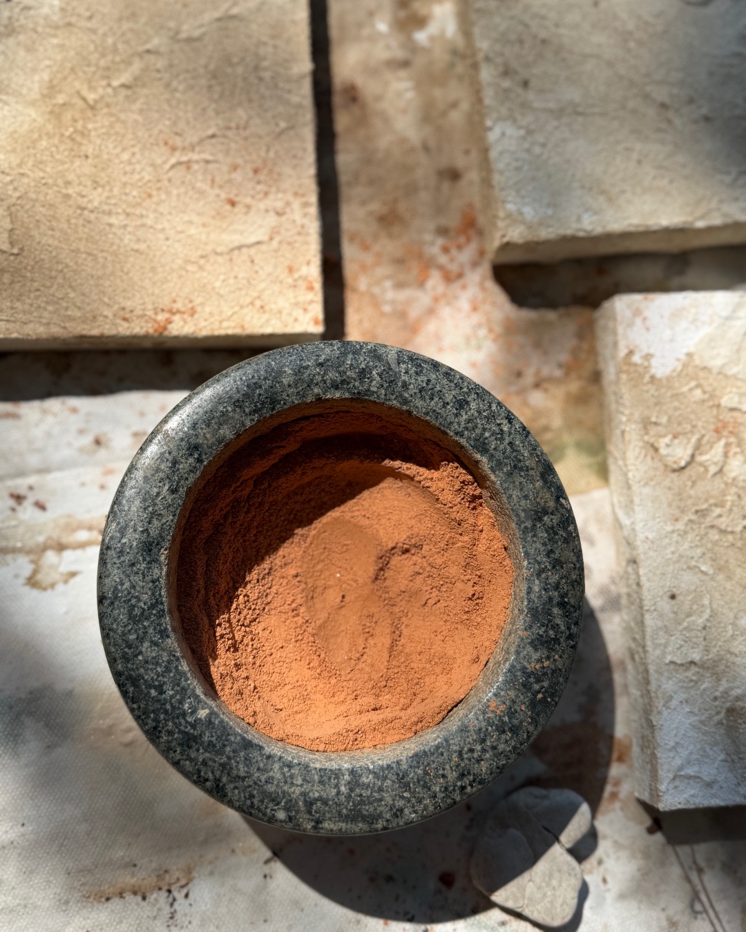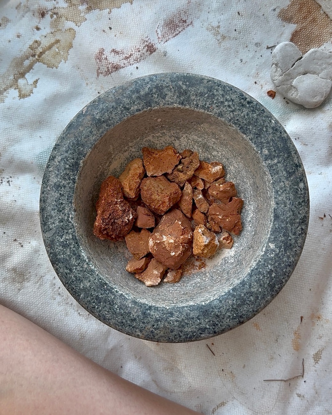 These paintings were created by the seaside, on the island of Murter in Croatia. Right there I gathered all natural materials that I need — red soil, orange stones, black charcoal from the remains of fire, brown soil, and raw orange calcite. This gave paintings so much powerful energy.